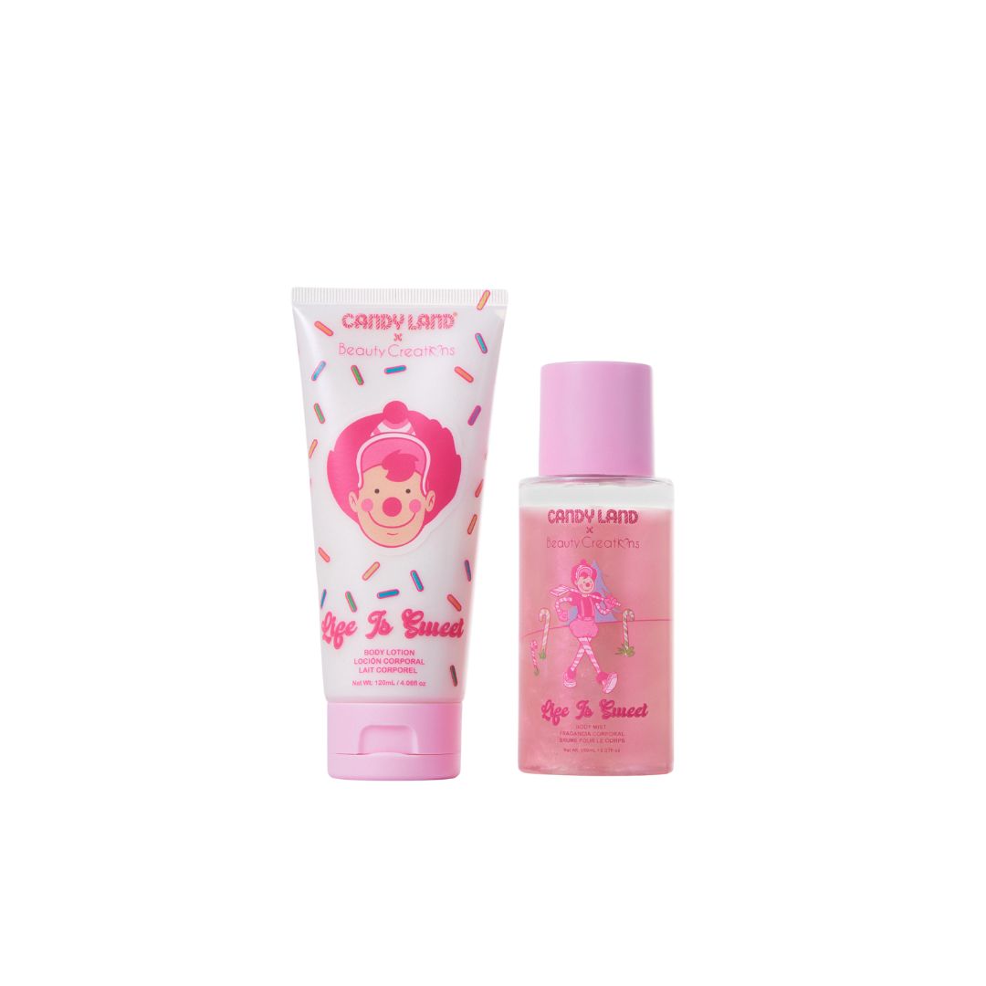 Set corporal de edición temática inspirado en el juego de mesa Candy Land™, que incluye una loción corporal y una bruma corporal (mist) con partículas brillantes. Ambos productos están diseñados para hidratar, nutrir y perfumar la piel con una fragancia dulce de fresa, crema batida y vainilla cálida. Su fórmula incorpora ingredientes nutritivos y de cuidado que aportan valor adicional.